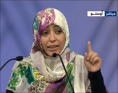 او افزود: بسیار مطمئن هستم که این انقلابهای صلحآمیز و دولتهای جدید در کشورهای عربی و باقی مناطق جهان تروریسم را طرد خواهند کرد. توکل کرمان نخستین زن عربی است که جایزه صلح نوبل را از آن خود کرده است.