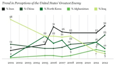 در حالی امروز 32 درصد از آمریکایی ها ایران را بزرگ ترین دشمن خود می دانند که این عدد حدود یک دهه قبل در سال 2001 ، تنها 8 درصد بود. این رقم در سال 2005 ، همزمان با روی کار آمدن احمدی نژاد به 14 درصد رسید و یک سال بعد به عدد 31 درصد ارتقا یافت.