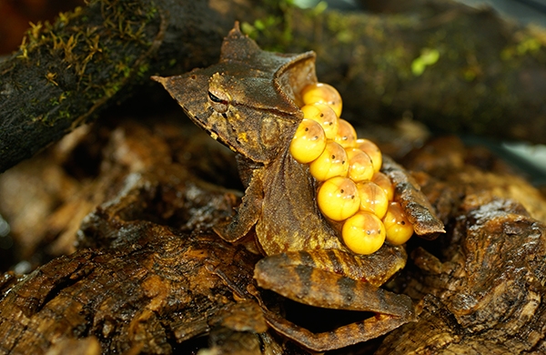 این قورباغه درختی کلاهخوددار با نام علمی Hemiphractus fasciatus تودهای از تخمهای زردرنگش را بر روی پشتش حمل میکند.