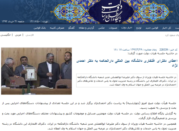 خبر اعطای دکترای افتخاری به احمدی نژاد در سایت رسمی دولتمدیر