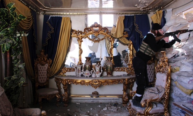 عکس زیر متعلق به خبرگزاری رویترز است و عمق فاجعه جاری در سوریه امروز را نشان می دهد. یک شورشی مسلح از داخل خانه ای تقریبا مجلل در شهر حلب در حال تیراندازی است.