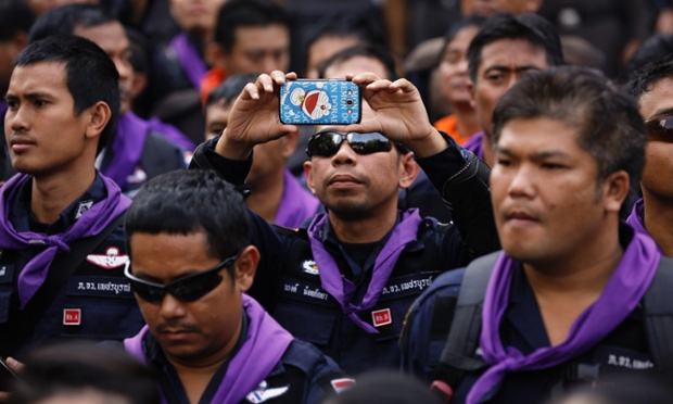 پلیس تایلند در حال فیلمبرداری از تجمع مخالفان در مقابل مقر مرکزی پلیس در بانکوک