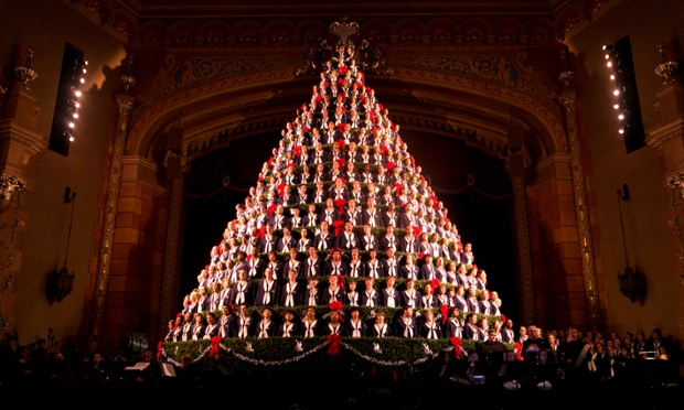 خوانندگان گروه کر در حال آواز خوانی در سازه ای شبیه درخت کریسمس (میشیگان آمریکا)