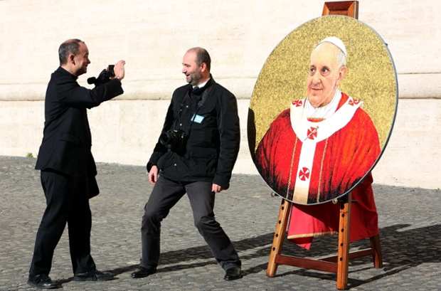 عکس گرفتن توریست ها در مقابل پرتره موزاییکی پاپ در واتیکان