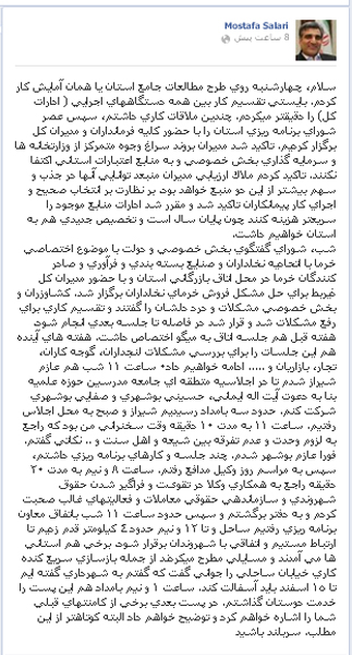 استاندار بوشهر در اولین مطلب خود در صفحه فیس بوکش نوشته است: