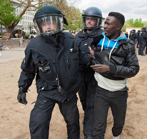 دستگیری یک پناهجوی خارجی در جریان یک اعتراض در کمپ پناهجویان در برلین آلمان