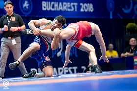 در وزن ۸۶ کیلوگرم که ۱۵ نفر شرکت کرده اند، کامران قاسم پور پس از استراحت در دور اول در دور دوم مقابل بهادر کودیروف از تاجیکستان با نتیجه قاطع ۱۰ بر صفر پیروز شد و به نیمه نهایی رسید. وی در این مرحله به مصاف دیپاک پونیا از هند رفت و در کمتر از ۴۰ ثانیه با ضربه فنی به برتری رسید و راهی فینال شد.