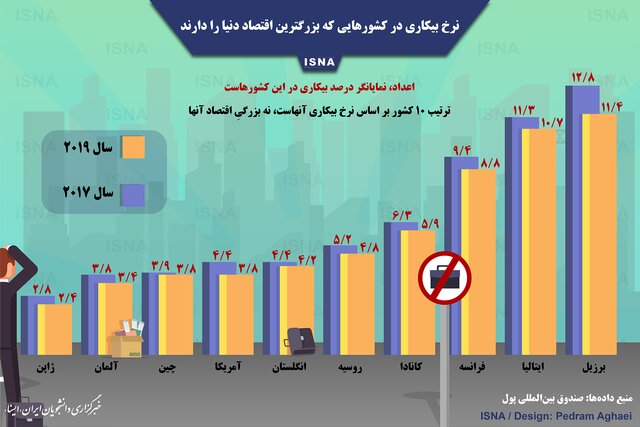 در این اینفوگرافی نرخ بیکاری سالهای ۲۰۱۷ و ۲۰۱۹ در کشورهای پیشروی اقتصاد جهانی به نمایش درآمده و مقایسه شده است.
